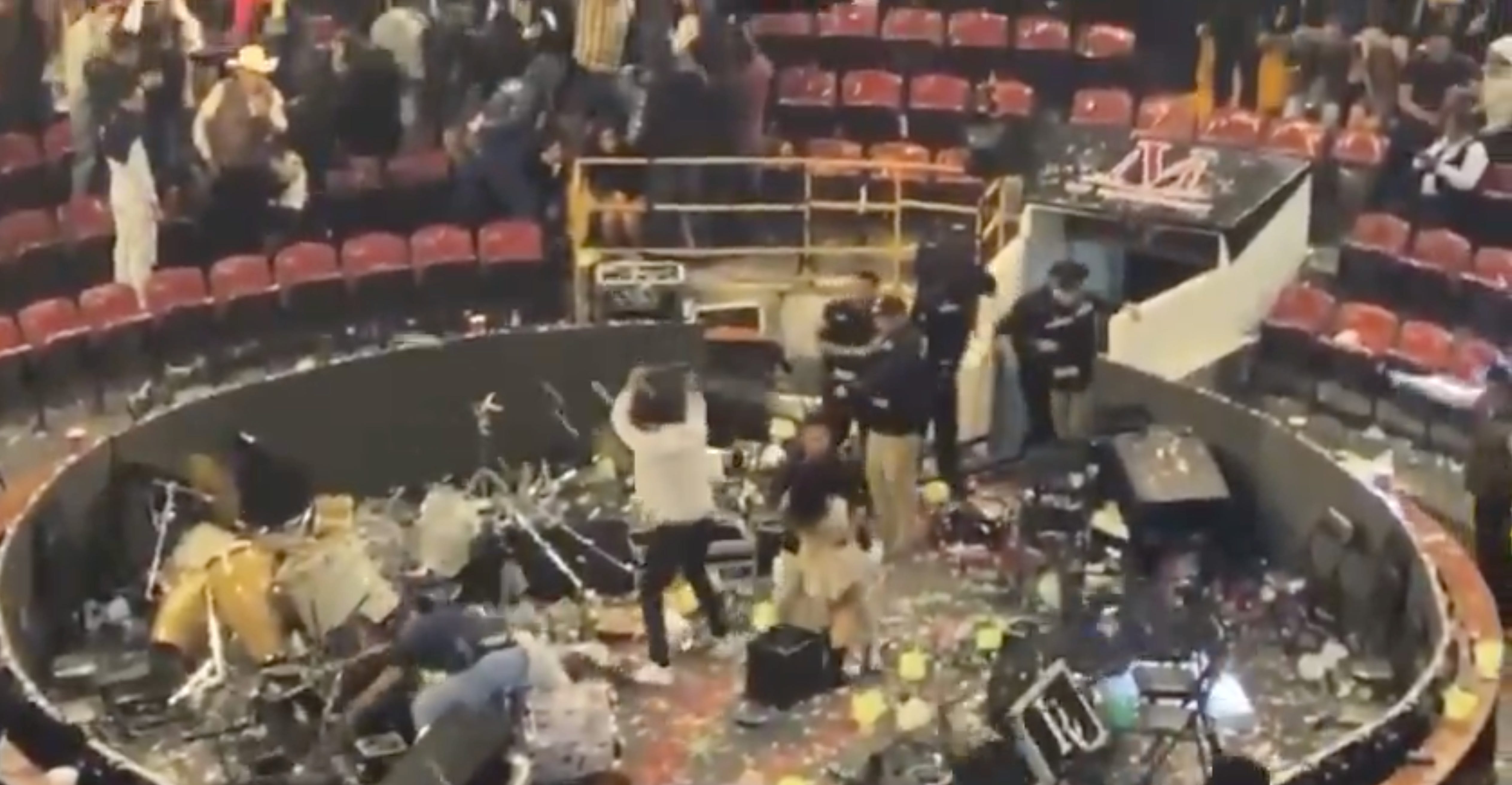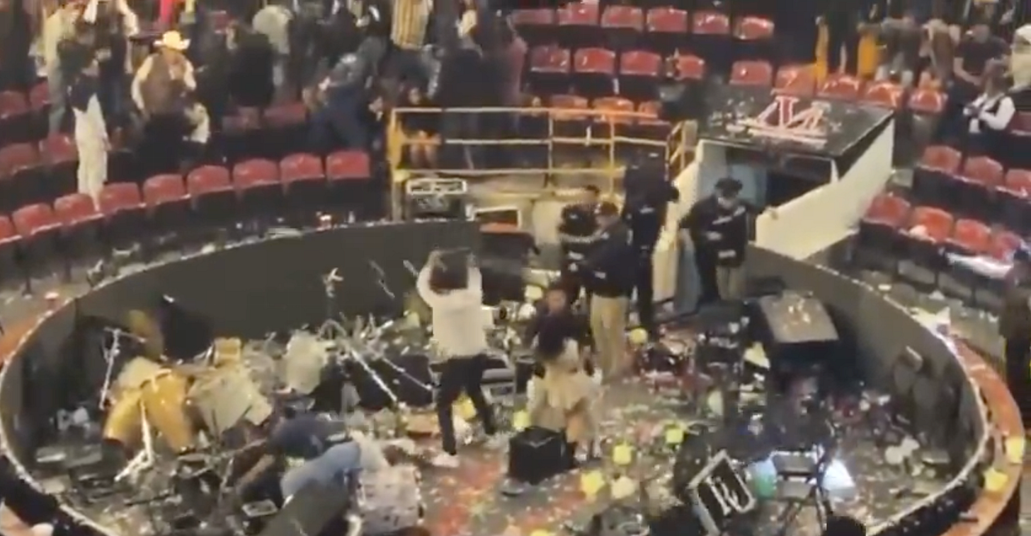 That night, Conriquez tried to perform in a circle surrounded by seats, a venue style also used for cock fighting. But the crowd booed. Conriquez tried to pacify the drunken revelers but in vain. Members of the audience became more heated and went from lobbing paper beer cups to steaming into the circle and smashing up instruments while Conriquez and his band fled. The demolition was captured on audience members’ cell phone videos, such as this below, which went viral on social media.