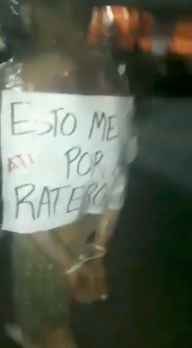 Cartels also offer crude but effective security against crimes such as theft and rape. They parade alleged robbers on the streets like this youth in Michoacán in 2019, stripped of clothes and carrying the sign, “This happened to me for being a rat.”