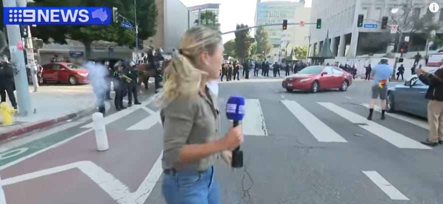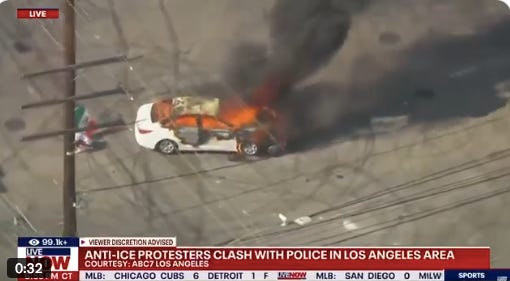 Agentes de la Patrulla Fronteriza con camuflaje verde se congregan en una histórica comunidad mexicoamericana. El Servicio de Inmigración y Control de Aduanas (ICE) realiza una redada en el Distrito de la Moda. Manifestantes marchan con pancartas de "Chinga la migra" (chinga la Patrulla Fronteriza y el ICE). Alborotadores cubren una patrulla con pintura en aerosol y le prenden fuego. El presidente Donald Trump ignora a un gobernador por primera vez desde 1965 para llamar a la Guardia Nacional. Balas de goma alcanzan a periodistas, uno en directo por televisión, otro obligando a un fotógrafo a ser operado. Jóvenes hacen señas de pandillas frente a un vehículo en llamas. Saqueadores roban zapatillas. Y la bandera mexicana ondea entre las llamas de Los Ángeles.