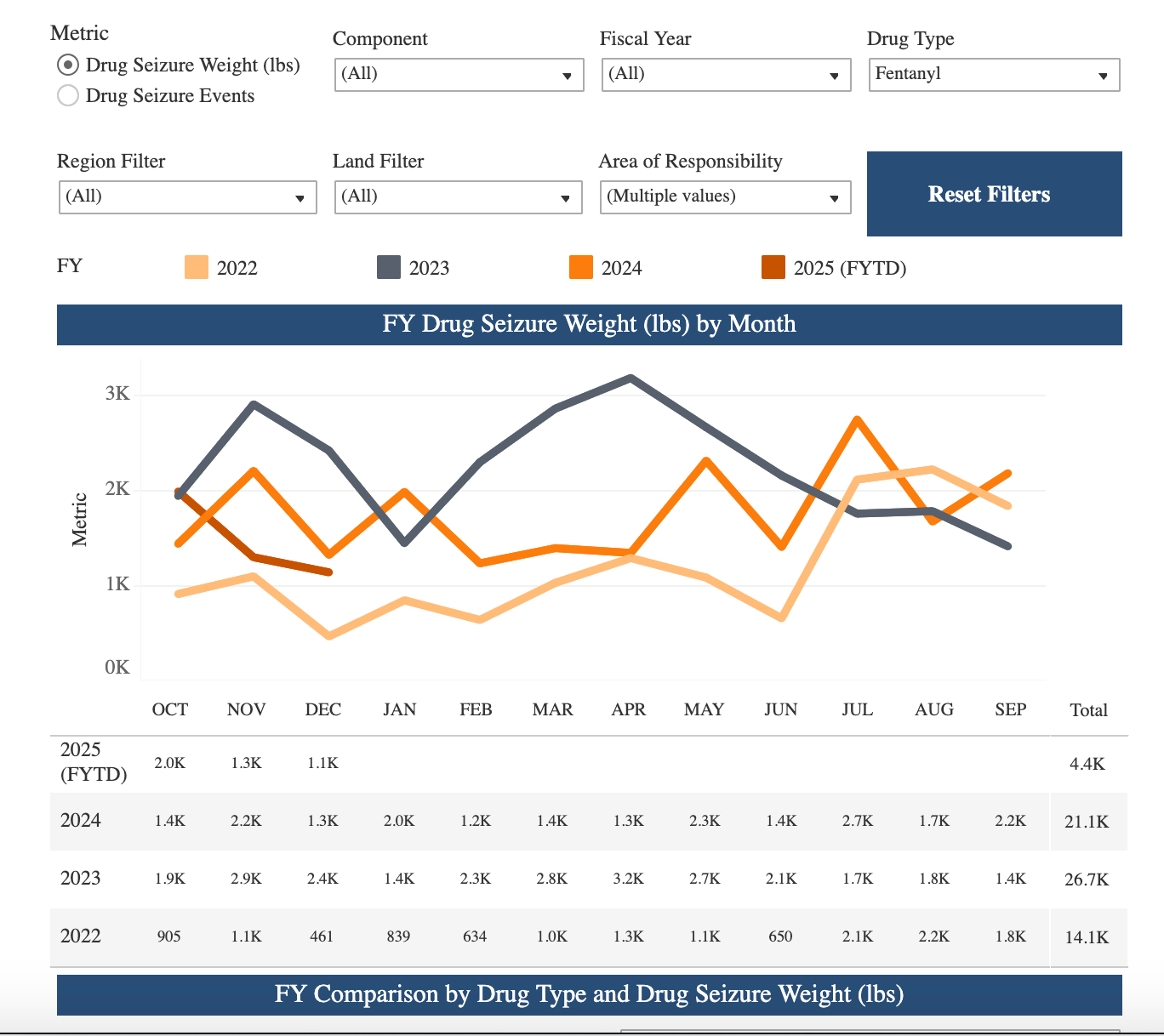 UPDATE - This story was updated on Jan. 30 to show that border seizures of fentanyl had fallen in December.