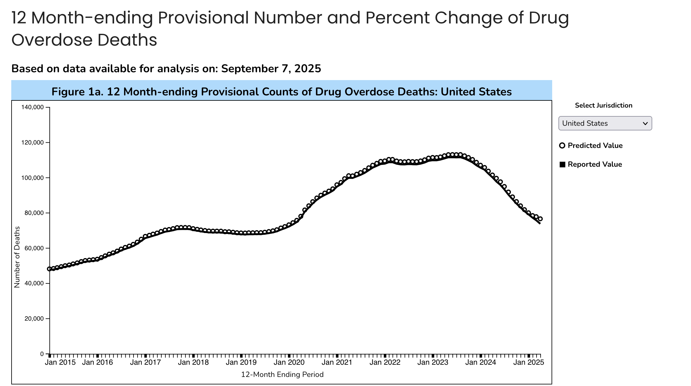 The fall in U.S. overdose deaths was first registered in late 2024, looking at data going back to 2023. But now it’s clear it has been declining steadily since a peak in August 2023. As I write here, there are various factors behind it, including use of Narcan, dealers changing the mix, and less addicts left to die. And the yearly number of overdose deaths is still incredibly high (about 77,000) in the last count. Yet this reduction is still overall good news (there is some).